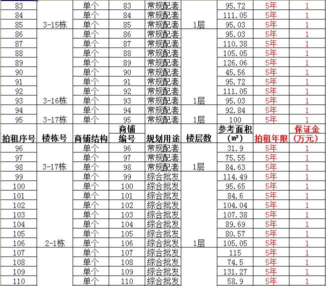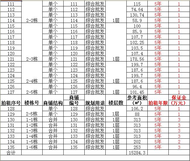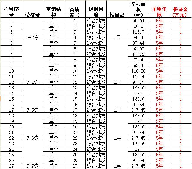 (一)拍租單個(gè)商鋪129間,使用期5年,每間商鋪預(yù)交競(jìng)租保證金1萬元, 詳見商鋪簡(jiǎn)介(欲競(jìng)租多間商鋪,保證金類推);
