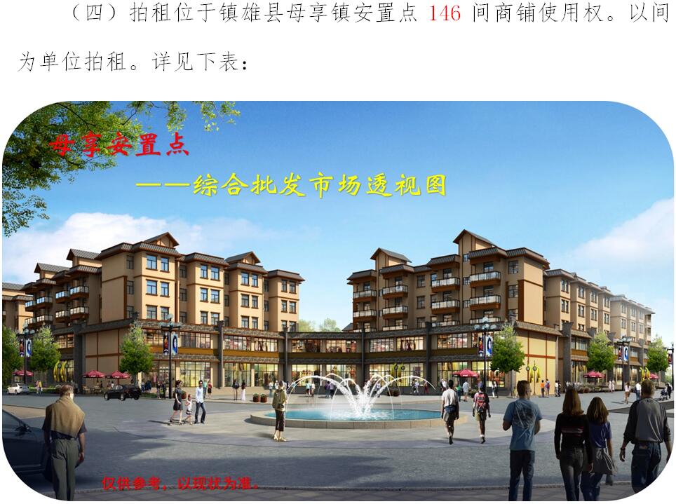 經(jīng)鎮(zhèn)雄縣人民政府批準(zhǔn),受相關(guān)部門(政府)委托,公開拍租位于鎮(zhèn)雄縣易地扶貧搬遷工程呢嚕坪安置點7棟獨立商鋪使用權(quán)、高山大地安置點27間(棟)商鋪使用權(quán)、魯家院子安置點24間(棟)商鋪使用權(quán)、母享安置點146間商鋪使用權(quán)、以勒物流城安置點67間(棟)商鋪使用權(quán)、碗廠安置點114間商鋪使用權(quán)。相關(guān)事項如下: